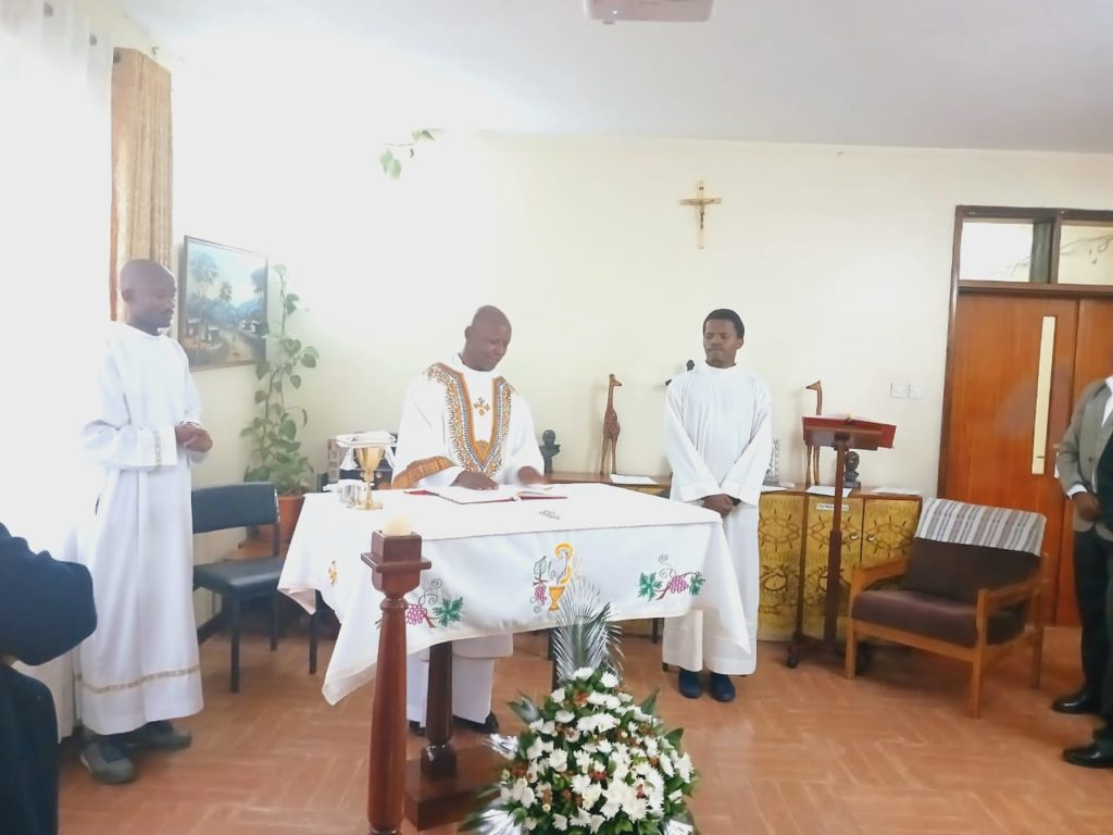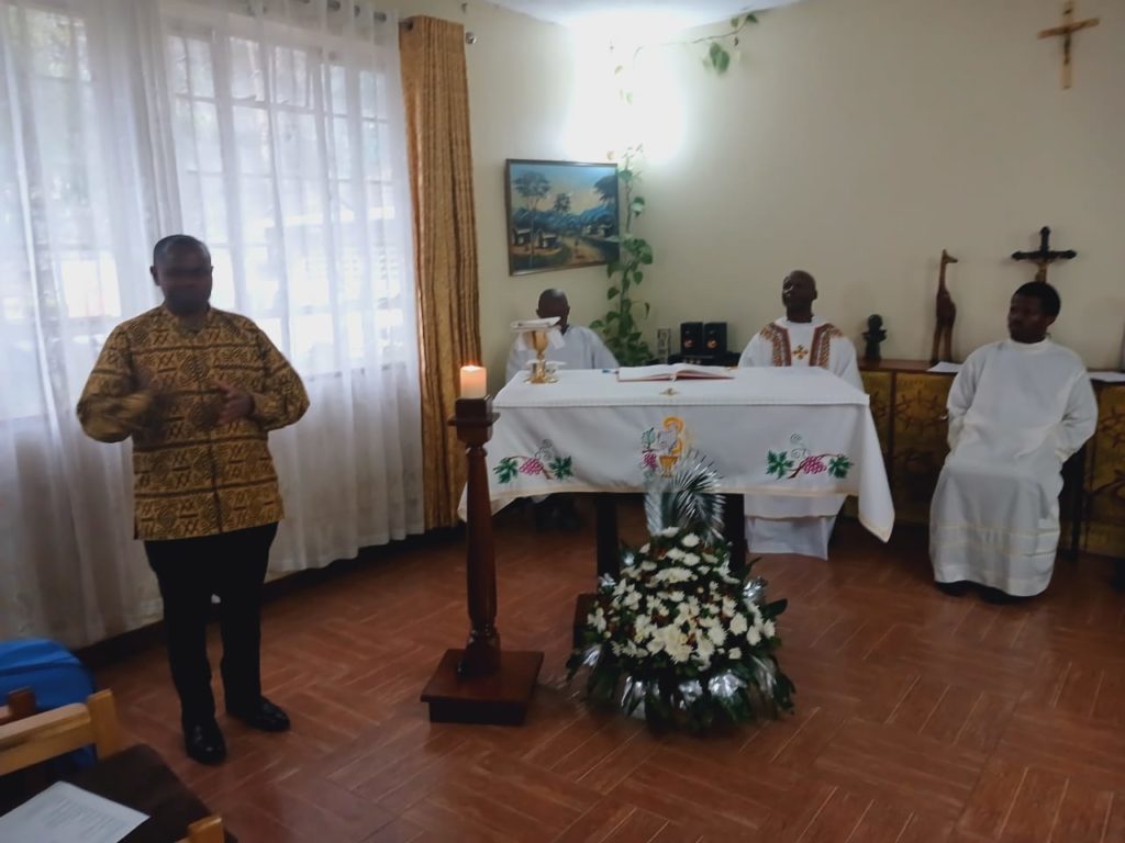 By 4:30 PM on 31st July 2024, Loyola House dining and seating rooms had already been transformed into a chapel. Loyola International Choir was busy rehearsing the special songs chosen for the feast. Guests started arriving, mainly from the regular mass attendants at Loyola House, and a few new guests. Together about 40 guests graced the celebration. To make the celebration more solemn Scholastics Gerald Kway and Adolfo Mudekereza helped as altar servers, and even used incense. Fr. Binamungu Mukasa served as the choir conductor.
