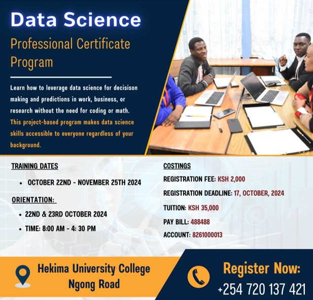 Have you ever wondered how you can transform a mountain of data into actionable insights without needing to understand complex coding or mathematics? At The Proposed Hekima University (PHU), in collaboration with Hekima University College, we’re making this possible with our highly anticipated 5-week, Project-Based Data Science & AI Program. Scheduled to run from October 22nd to 25th November 2024, at our campus on Ngong Road. This program is designed to empower you with practical data science skills that can elevate your decision-making capabilities and drive impactful results.